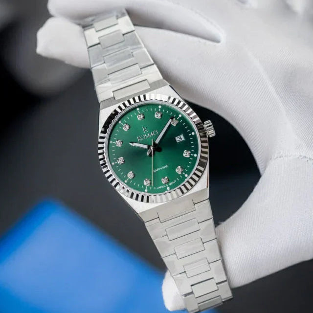 Elegancia moderna en cada detalle. Este reloj Kosmo destaca por su esfera verde con acabado sunray, combinada con una caja y correa en acero inoxidable 316L. Su cristal zafiro y movimiento de cuarzo japonés garantizan precisión y durabilidad.