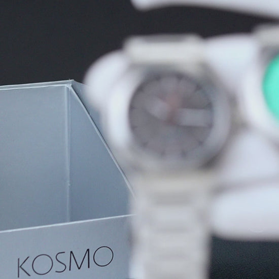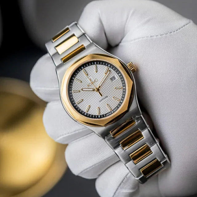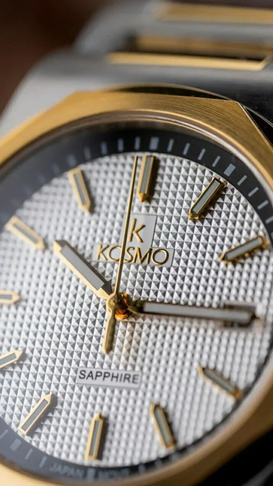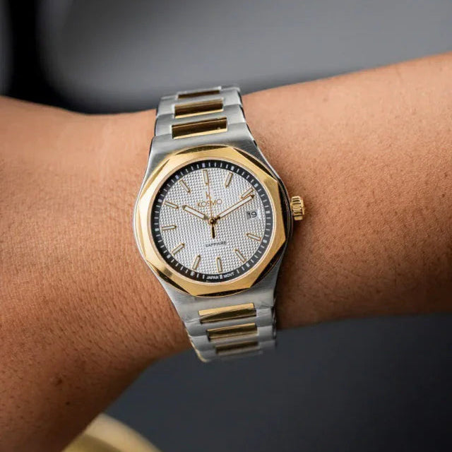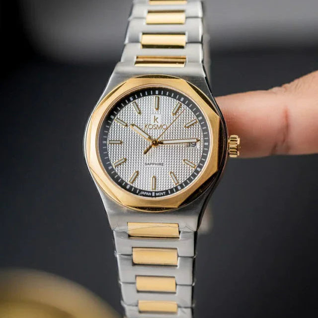 El Kosmo 609-7 destaca por su diseño bicolor elegante en acero inoxidable plateado y dorado. Su esfera blanca limpia y luminosa armoniza con agujas doradas, todo protegido por un resistente cristal de zafiro. Perfecto para un look clásico con un toque moderno.